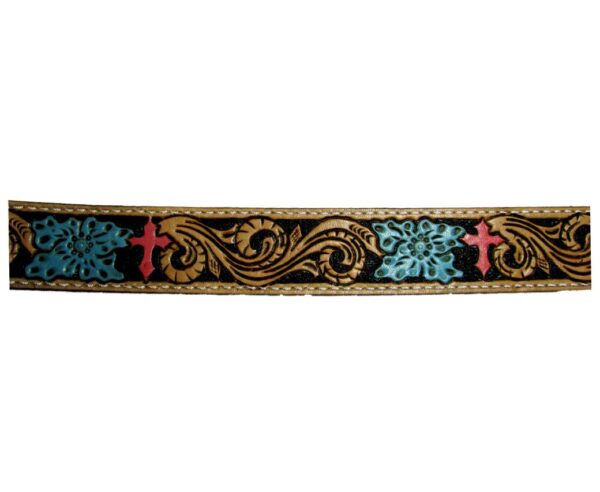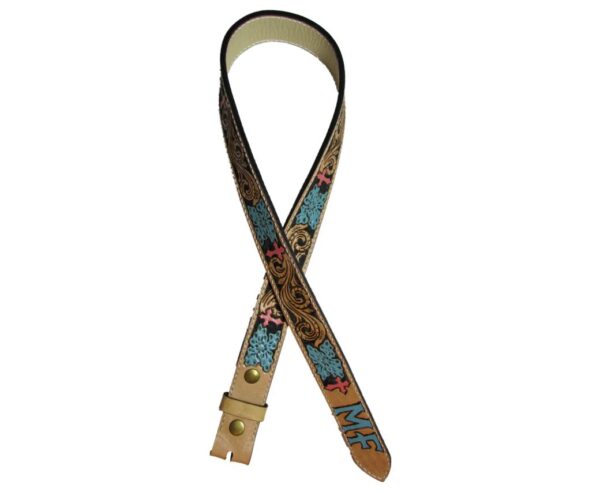 Elaborado en cuero de res de 3.5mm y reforzado con forro de res de 1m y costura a mano con hilo de nylon. Los detalles de este modelo son pintados totalmente a mano y el fondo en color negro logran un realce del gabado en cuero natural.